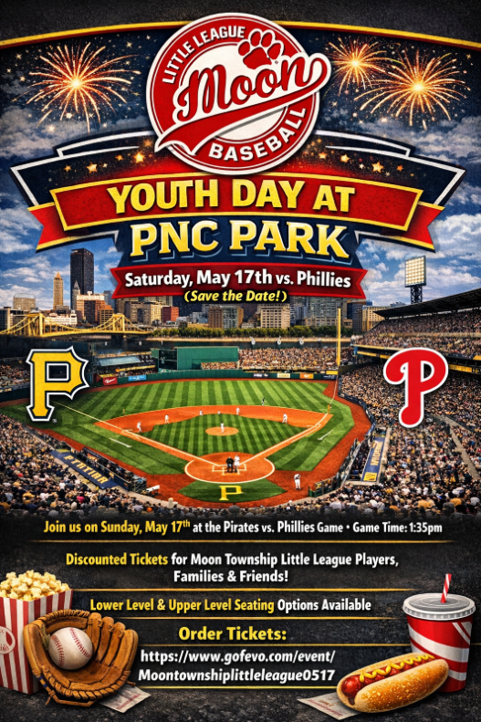 We have linked up with the Pittsburgh Pirates once again to create a Moon Township Youth Day at PNC Park. Join us on Sunday May 17th at the Pirates and Phillies game, game time 1:35pm.
